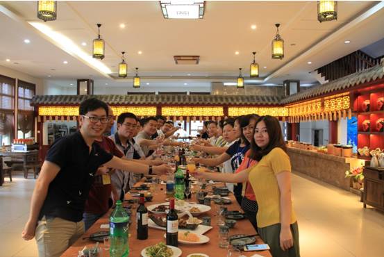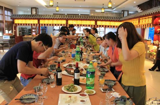 晚餐之前,為了活躍氣氛,人力資源部為大家精心準(zhǔn)備了“筷樂傳遞”的游戲,長桌對(duì)面分為兩組進(jìn)行PK,用筷子把乒乓球從頭傳到尾的隊(duì)為勝,獲勝的隊(duì)有項(xiàng)特權(quán)可以讓失敗的隊(duì)為自己夾菜吃。一個(gè)簡(jiǎn)單的游戲讓大家體會(huì)到團(tuán)隊(duì)配合的力量,也讓整個(gè)晚餐的氛圍愉悅起來。