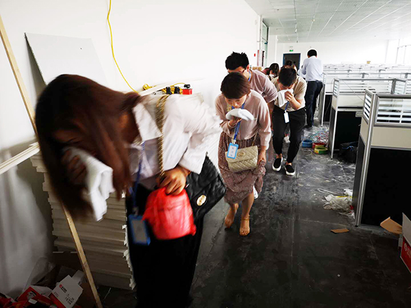 警報(bào)響起,疏散引導(dǎo)人員組引導(dǎo)員工與業(yè)戶開始向疏散走道、安全出口緊張有序的進(jìn)行疏散。