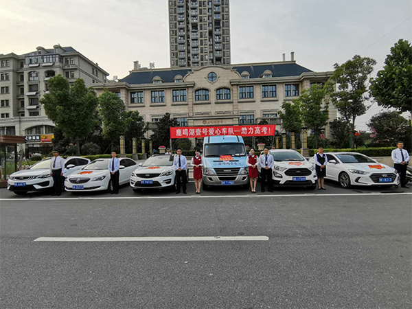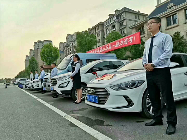 高考前一天服務(wù)中心組織員工愛心車隊,護送考生加油助威。