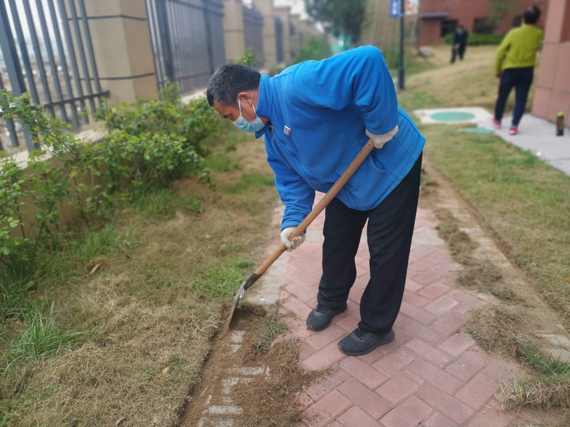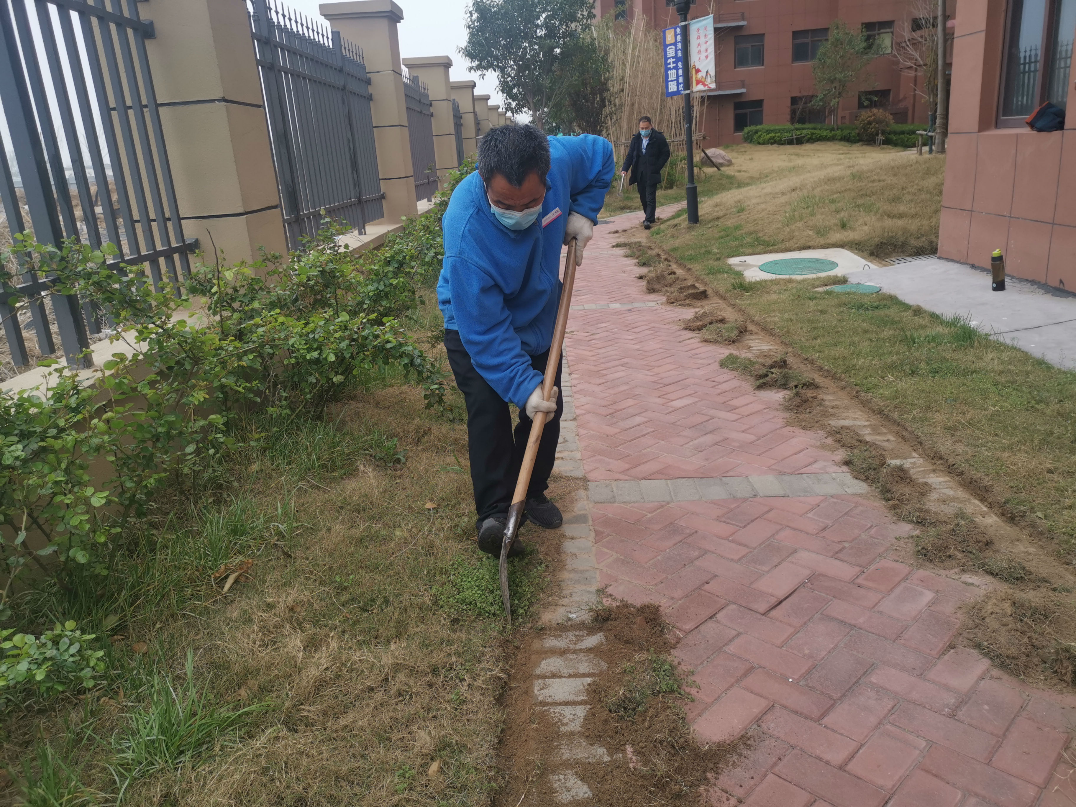 因為沒有文化,小學畢業不識幾個大字,所以不知道那么多大道理,但是清楚怎么做能讓自己踏實。靦腆,或許是因為有著些許不自信,但是說到自己的工作,頭頭是道,認真的表情很感染身邊的人。看著他挖隔離溝的動作,突然問他,“這的很費力吧?”他笑著說,“那可不,得用巧勁,這里面也是有研究的,不費力但是費鞋。”他指指他新買的鞋笑道,“看看,鞋底都要磨穿了!”后來,與徐莊環境主管交談,得知王師傅是徐莊本地村民,他在疫情期間主動協助門崗給村民檢查、測體溫、溝通,也讓項目的疫情管控增加了便利。