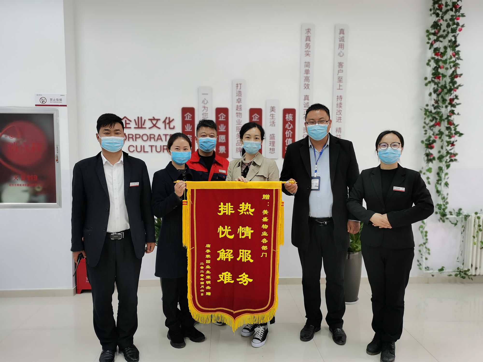 4月8日下午,這位年輕的女業主,便帶著一面錦旗再一次走進了廟李家園東苑的服務大廳,這次卻帶著對工程董師傅誤會的歉意和對物業中心熱情服務的感謝,并和大家合照留念。