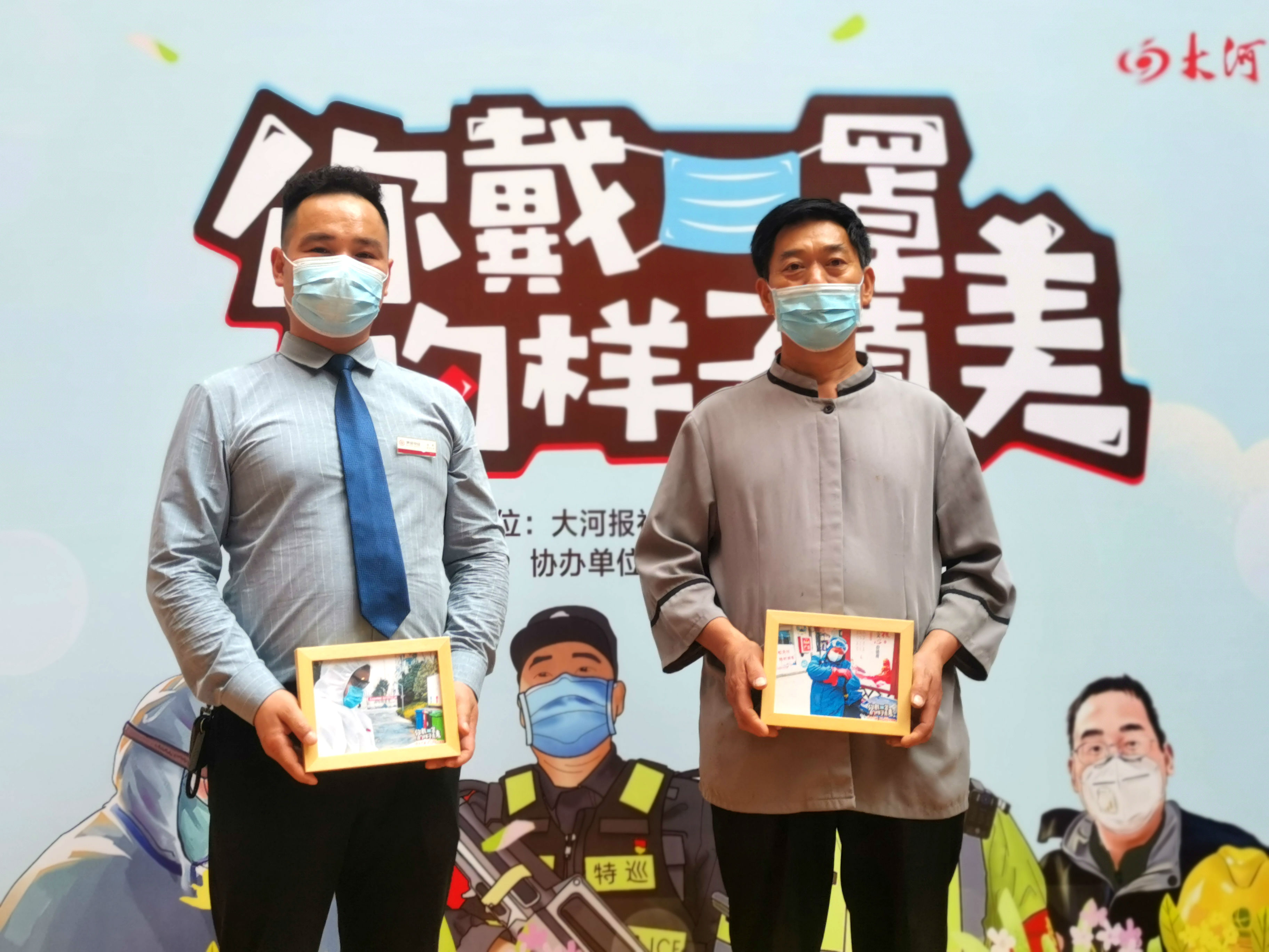 美盛物業(yè)兩名物業(yè)戰(zhàn)“疫”英雄代表手拿紀(jì)念相框一起合影