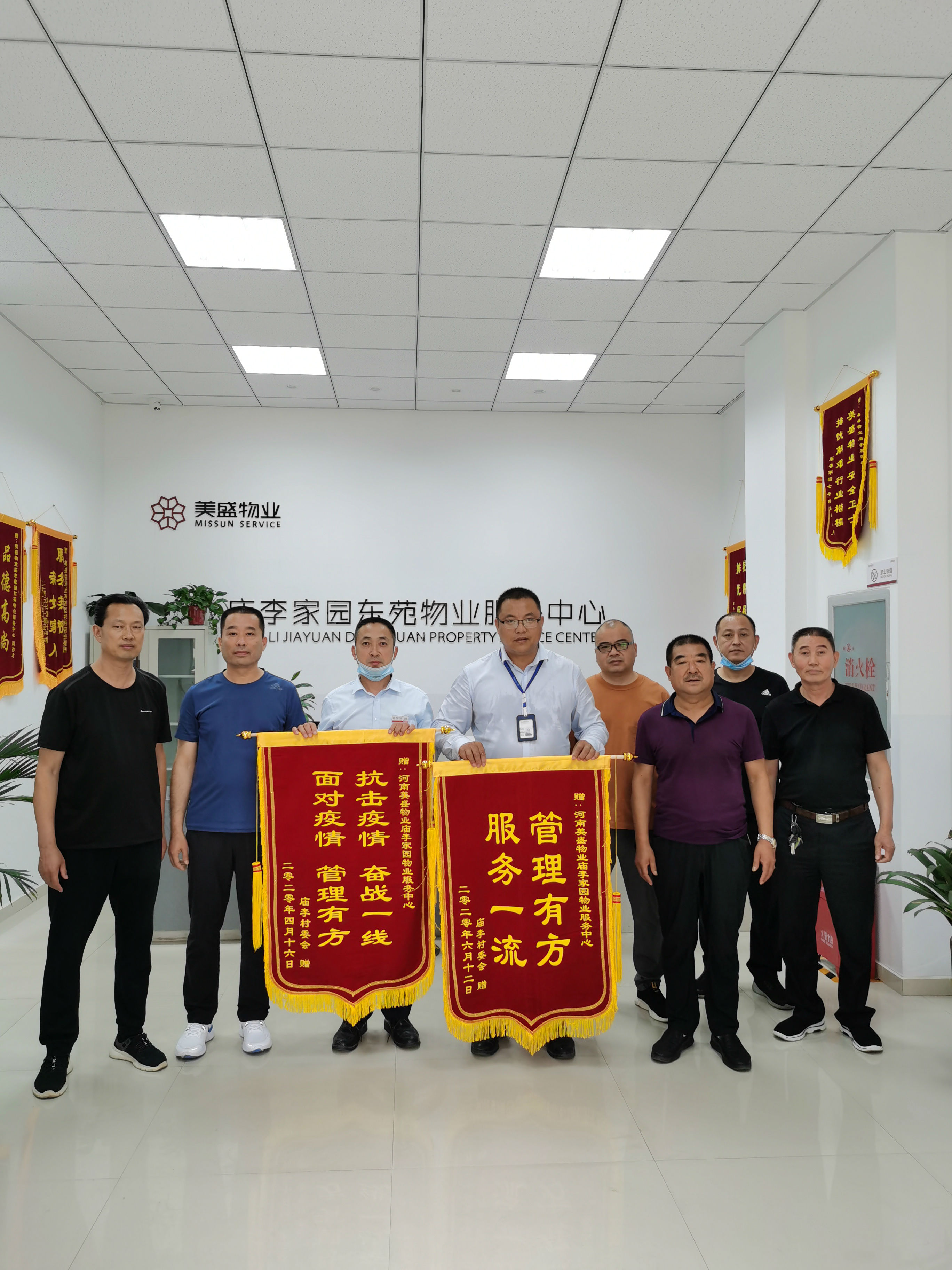 他們的勇敢付出、在非常時期提供貼心、周到的服務,得到村委會與業主的普遍認可和贊賞。為表達對美盛物業在此次疫情防控期間做出貢獻的感謝,廟李村委書記、村長、各隊隊長一行人于6月15日,給廟李家園物業服務中心,送來寫有“抗擊疫情·奮戰一線”、“管理有方·服務一流”的兩面錦旗。